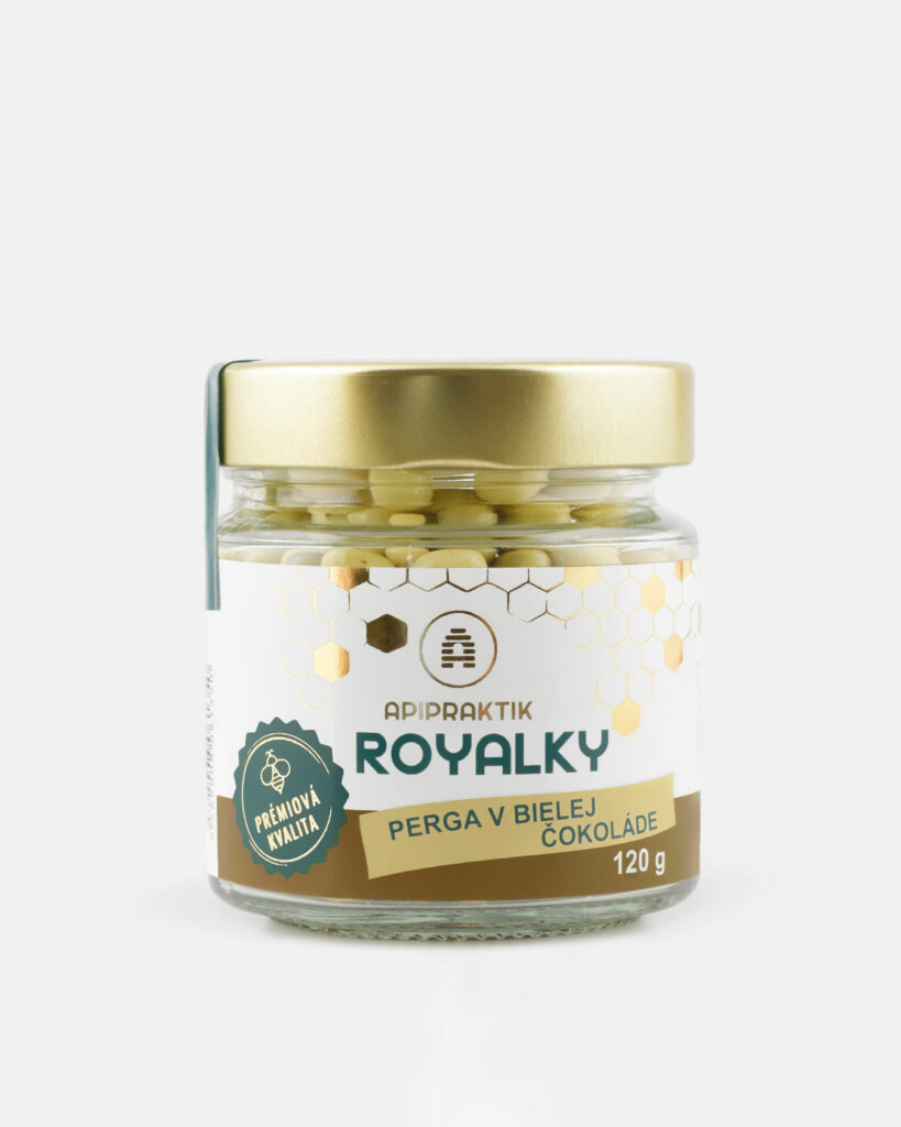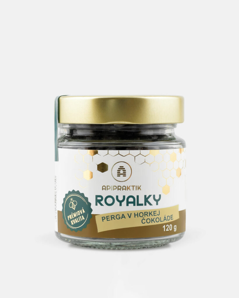 Práve horkú a bielu čokoládu používame na výrobu našich Royaliek. Ide o vysokokvalitnú 72% pravú taliansku čokoládu, ktorá špeciálnym výrobným procesom obaľuje pergu, fermentovaný včelí peľ. Samotná perga poskytuje antistresové a antidepresívne účinky a podporuje fyzickú a mentálnu práceschopnosť. Obsahuje také prírodné antidepresíva ako zinok a vitamín B6. Obsahuje však aj také látky, ktoré sú potrebné pre plnohodnotnú činnosť mozgu a iných častí centrálneho nervového systému. Horká čokoláda v prvom rade obsahuje široké spektrum antioxidantov, ako sú polyfenoly, flavanoly, katechíny. Celkovo sa v nej nachádzajú látky ako sodík, draslík, vápnik, horčík, fosfor, železo, meď, zinok a mangán. Okrem toho aj tiamín, riboflavín, niacín a stopy karoténu, vitamínu C a D, vitamínu B6 a B 12. Spomínané flavanoly môžu znížiť riziko úmrtia na srdcovocievne ochorenia a pomáhajú udržať náš mozog v kondícii. Kakao obsiahnuté v royalkách z horkej čokolády významne zlepšuje kognitívne funkcie u starších ľudí, ktorí ich majú narušené. Prejavuje sa to zlepšením slovného vyjadrovania, a navyše podobne ako perga a čokoláda, aj kakao pozitívne zlepšuje funkcie mozgu.