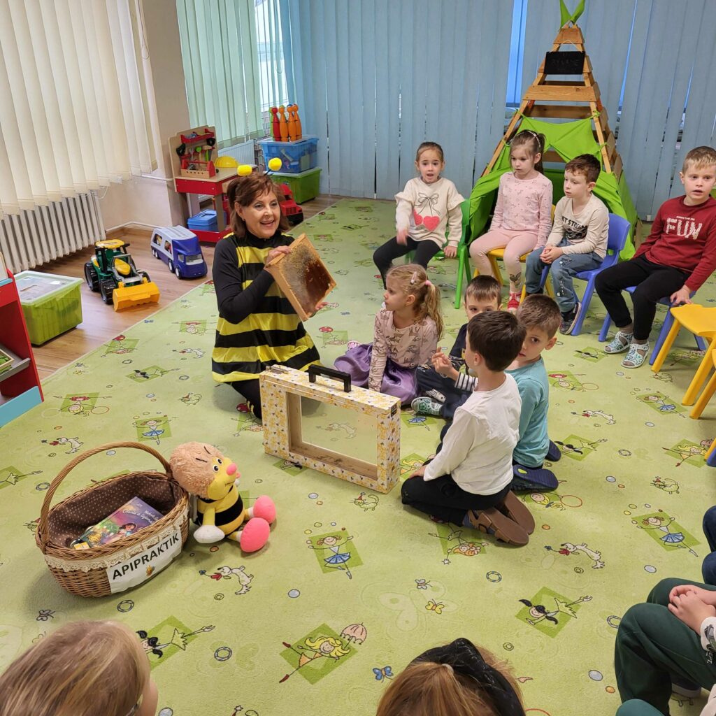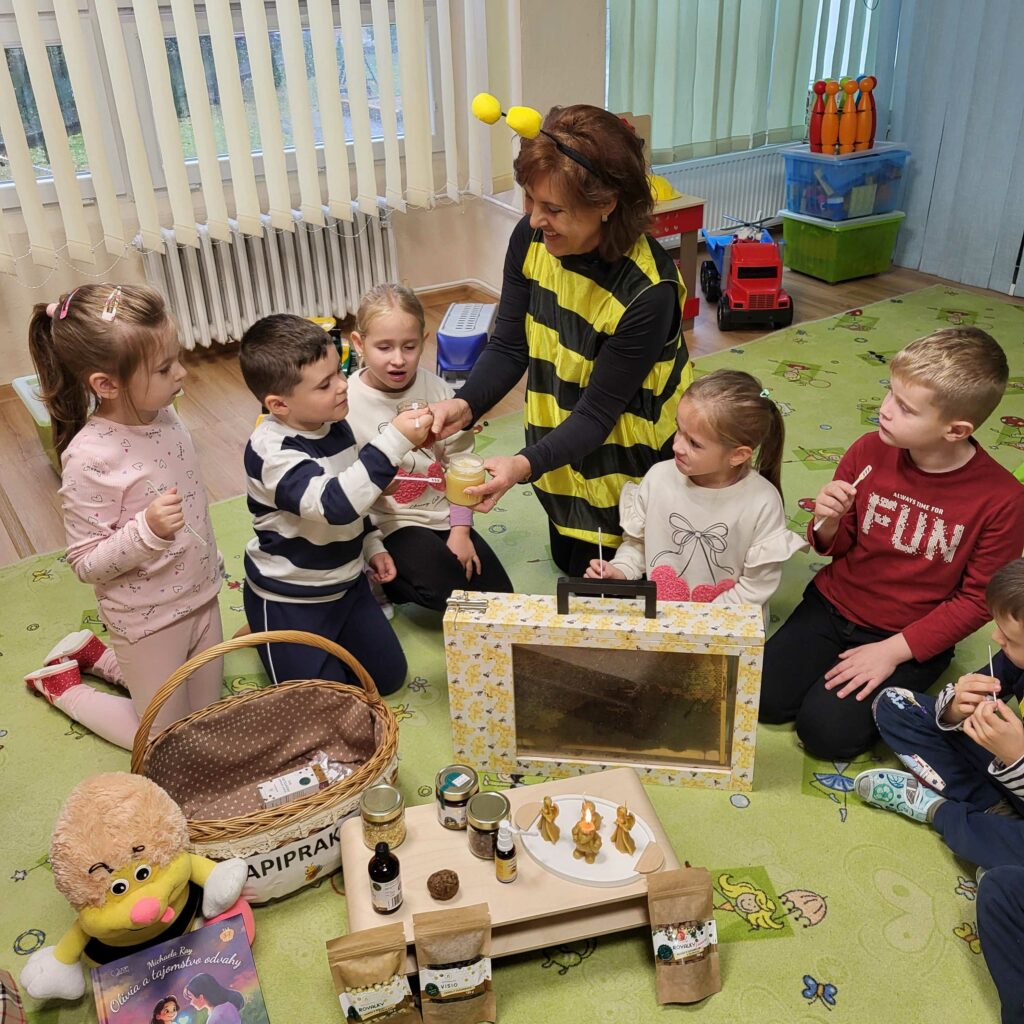 Iveta deťom hravou formou porozprávala o tom, ako vzniká med, peľ, perga, propolis, vosk a materská kašička. Malí poslucháči sa dozvedeli, že každá včielka má v úli svoju dôležitú úlohu a že všetky spolupracujú, aby vznikli tieto vzácne včelie produkty. Pomocou rekvizít a krátkeho rozprávania sa deti preniesli priamo do včelieho úľa – spoznali včielku robotnicu, trúda aj kráľovnú.